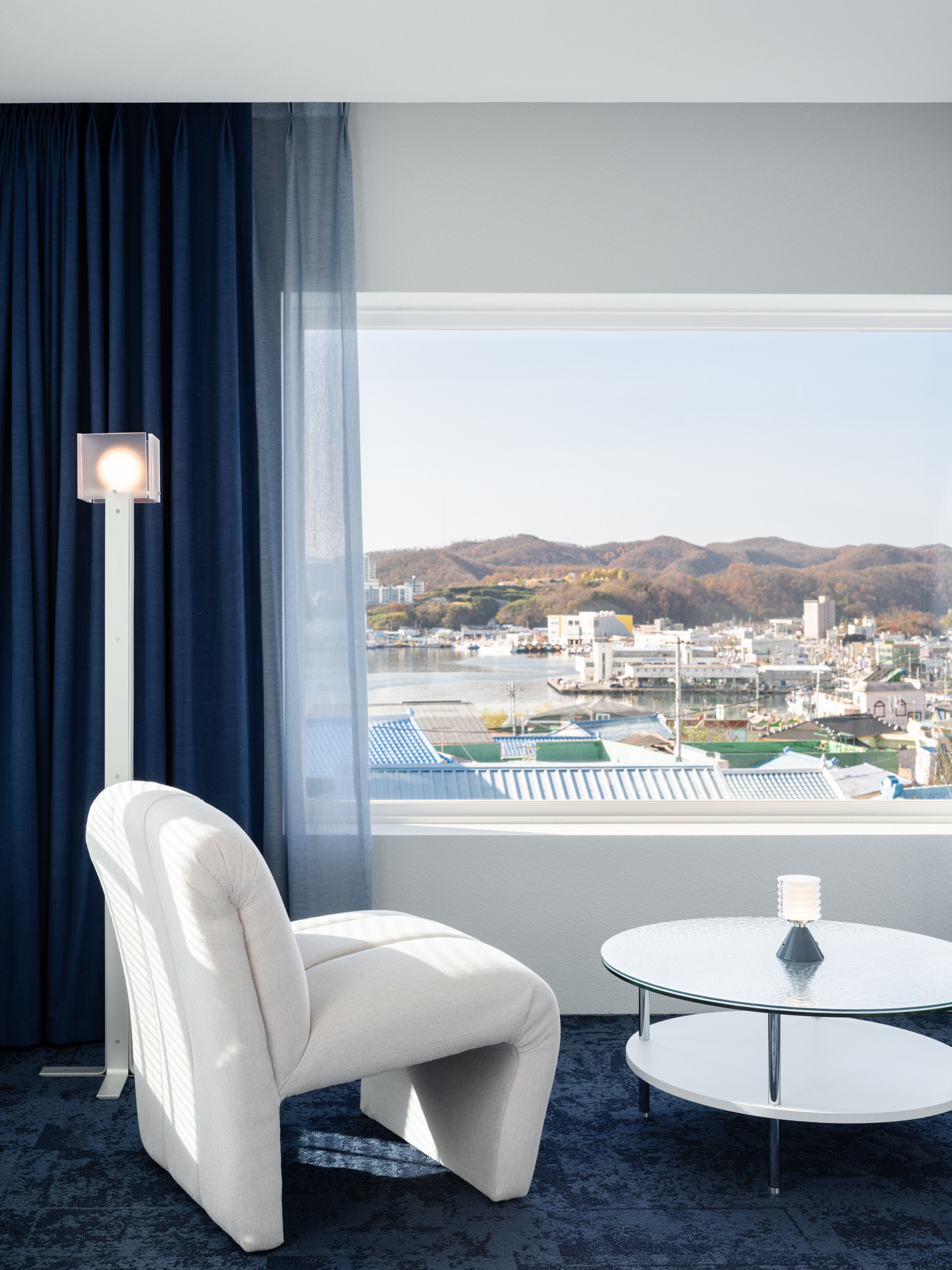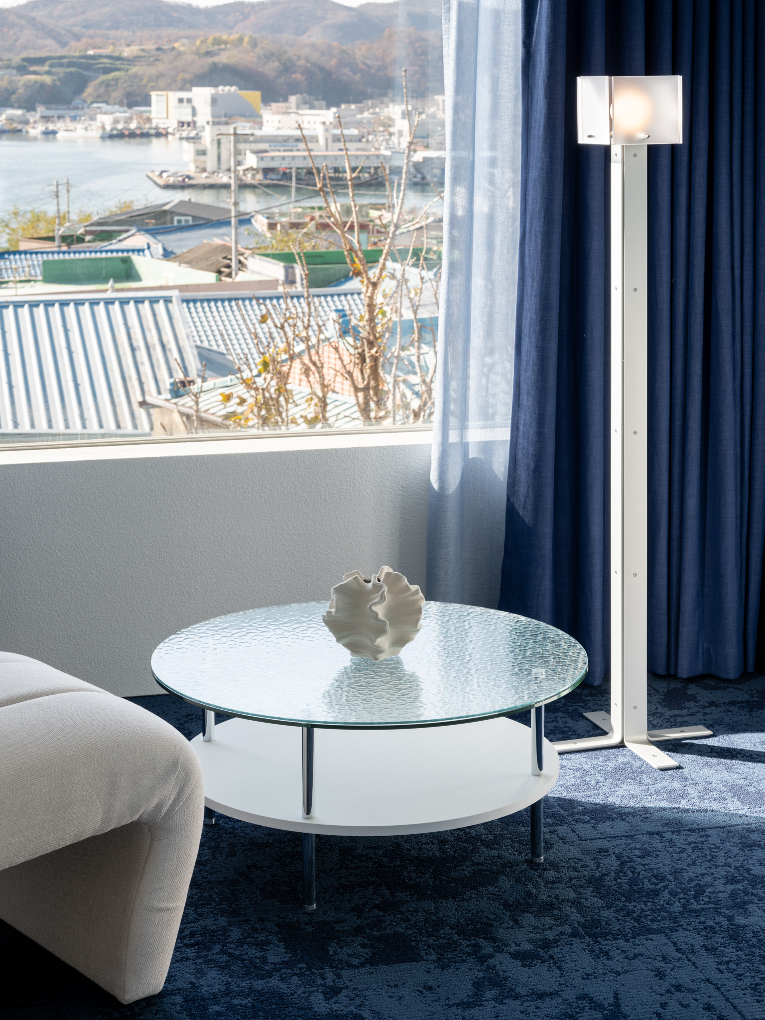 Beyond the full-height window, the ocean is not merely a backdrop but continues into the space through light, lines,